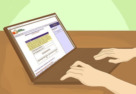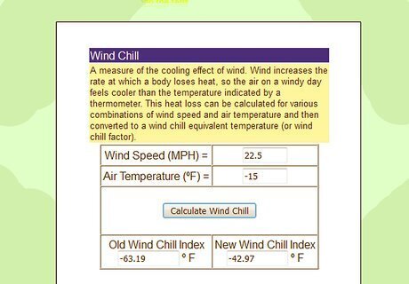 Find an online wind chill calculator. Try the calculators at the US National Weather Service, freemathhelp.com, or onlineconversion.com. All of these calculators use the new wind chill formula adopted by the US and other countries in 2001. If you use a different calculator, try to find one that uses this formula; the old formula can give misleading results.