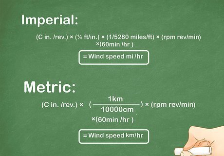 Calculate wind speed. Convert the circumference you calculated into a more useful unit for measuring wind speed (miles or kilometers). Multiply the result by the rpm you calculated to get the total distance traveled in one minute. Multiply the result by 60 to get the distance traveled in one hour (mph or km/h). Here are the full formulas in imperial and metric units: Imperial: (__circumference__ inches/revolution) * (1/12 ft/inches) * (1/5280 miles/ft) * (__rpm__ revolutions/minute) * (60 minutes/hour) = __wind speed__ in miles per hour. Metric: (__circumference__ centimeters/revolution) * (1/100000 kilometers/centimeter) * (__rpm__ revolutions/minute) * (60 minutes/hour) = __wind speed__ in kilometers per hour.