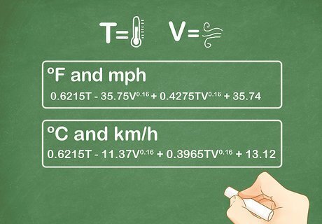 Enter these values into the formula. There have been several wind chill formulas over the years and in different regions, but we'll use the one currently used by the UK, US, and Canada, created by an international team of researchers. Plug in your numbers to the formula below, replacing T with the temperature and V with the wind speed: If using ºF and mph: Wind chill temperature = 35.74 + 0.6215T - 35.75V + 0.4275TV If using ºC and km/h: Wind chill temperature = 13.12 + 0.6215T - 11.37V + 0.3965TV