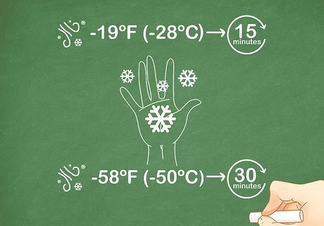 Understand wind chill. Wind chill is an invented concept that describes how wind increases heat loss on exposed skin. In extreme conditions, this can be a major factor in how soon frostbite sets in. At a wind chill temperature below –19ºF (-28ºC), frostbite will occur on exposed skin within 15 minutes or less. Below -58ºF (-50ºC), exposed skin can freeze within 30 seconds.