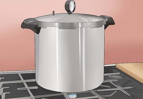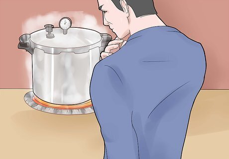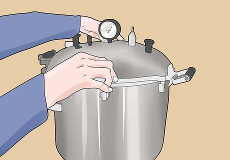 Take safety precautions. When used correctly, modern pressure canners rarely cause the types of accidents that older models used to cause. They have safety features in place to prevent them from exploding with pressure buildup. That said, it's important to handle the machine with care. Take the following precautions before you start canning: Keep children and pets away from the kitchen. The machine gets very hot, and a small child could pull it down from the counter. Kids and pets underfoot could cause you to trip and break a glass jar. It's best to keep them out of the kitchen while you're concentrating on canning. Check the vents in your pressure canner. Each time you use it, check to make sure the vents aren't clogged. If they are, dangerous pressure could build up in the machine. Make sure the pressure gauge is accurate. If it's not, too much pressure could build up without you realizing there's a problem. Be ready to stay close by at all times. Don't leave the kitchen while you're using the pressure canner.