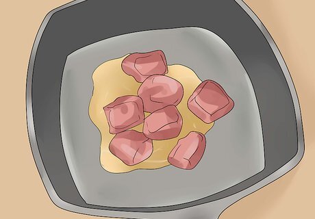 Brown the meat. Heat some oil in a cast iron skillet and brown the meat for several minutes on each side. This shrinks the meat, allowing you to pack more in each jar. Browning meat also brings out a good flavor that will improve over time as the meat sits in the jar after canning. It is not necessary to cook the meat; you can can it raw instead, unless you're canning ground meat. Season the meat with spices before cooking it if you'd like. You could also wait until you're ready to use the meat to season it.