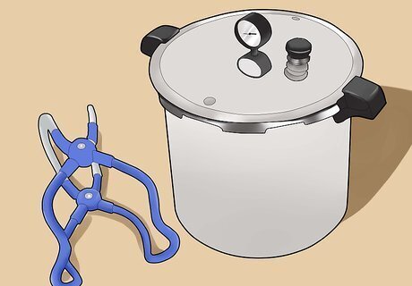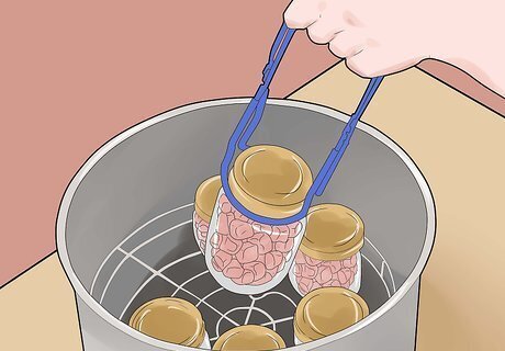 Get a pressure canner. This type of canner heats the jars of food to 240 °F (116 °C), which is necessary in order to ensure that all the bacteria and other contaminants are killed. Since meat is a low acid food, and does not contain natural preservatives, using a pressure canner is the only safe way to can it. Pressure canners are available new at kitchen supply stores, but you may be able to borrow one or find a used one online. Consider getting a jar lifter to use with the canner. This tool is used for moving the jars out of the steaming water when the canning process is complete. Do not use a simple bath canner to can meat. Bath canners do not raise the internal temperature of the meat to a high enough level to kill the contaminants.