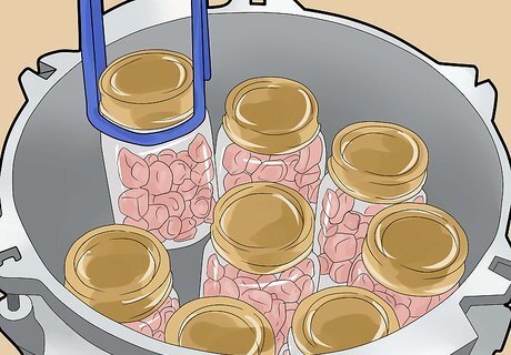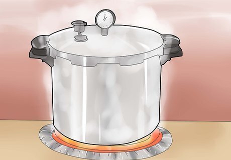 Place the jars in the canner. Use the jar lifter to set them into the canner. Fit as many as you can in the canner at once. Close the lid on the canner and lock it in place. Depending on the type of canner you are using, either leave the pressure weight off or leave the petcock open. Be sure to read the instructions on the canner to make sure you complete the process correctly. Don't stack jars on top of one another.
