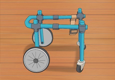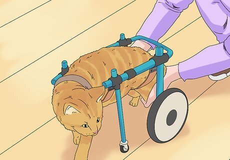 Purchase a cat wheelchair or cart. If your cat’s CH is severe, a cat cart or wheelchair can help improve their quality of life, as well as improve muscle development and mobility. You can purchase adjustable pet wheelchairs or carts for your cat with CH. Consult with your veterinarian about the purchase of a cat wheelchair. Cat wheelchairs can be found at some pet stores, as well as online specialty retailers with a focus on pets with mobility challenges. You can also make their own cat wheelchair with PVC piping, fabric and cart wheels.