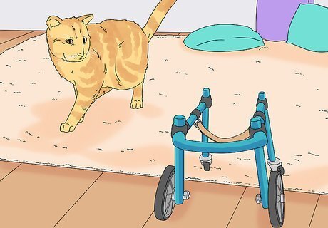 Put your cat in the wheelchair for progressively longer periods. Put your cat in the wheelchair for a few minutes. Let your cat explore with the new device. Then, slowly build up the amount of time that your cat spends in the wheelchair. You can use toys to encourage your cat to move around in the wheelchair. You should block stairways so that your cat doesn’t fall down the stairs in the wheelchair. Remove obstacles in your house so that your cat doesn’t get stuck in the wheelchair.