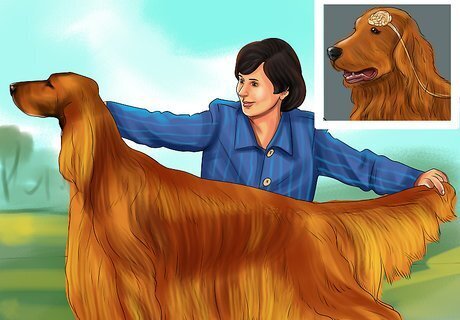 Groom your dog regularly. Irish Setters have beautiful coats that need regular maintenance. Brush your dog’s fur at least two to three times a week in order to prevent matting, and give it a bath monthly. Start at your dog’s head and work your way down its body. Be careful around sensitive areas, like its belly. Use a finer comb if you come across tangles or mats. Comb them out thoroughly, but give your dog breaks as needed. Give it a treat or some play time if it gets overwhelmed or uncomfortable. Consulting a professional groomer or trimming your dog’s fur regularly is optional, and will help keep it looking its best.