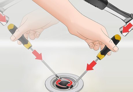 Tap the drain clockwise with a screwdriver and hammer to tighten it all the way. Put the tip of the screwdriver against one of the nubs with screw holes inside the drain body. Hit the top of the screwdriver with a hammer to tighten the drain body about 1/2 a turn more to complete the seal. You can also use some kind of utensil, like pliers, to wedge inside the drain body against the screw hole nubs and tighten it another 1/2 a turn.