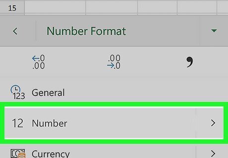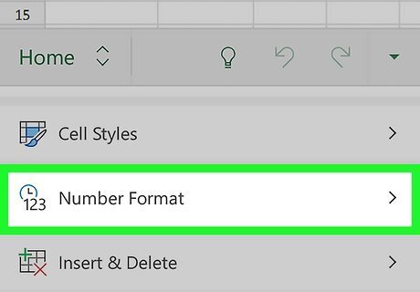 Scroll down and tap Number Format. This option is listed next to an "ABC 123" icon on the toolbar menu. It will open your cell formatting options. This option is found in your toolbar's Home tab. If the toolbar opens up to a different tab, such as Insert, Formulas, Data or View, tap the tab's name on the top-left of the menu, and select Home.