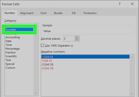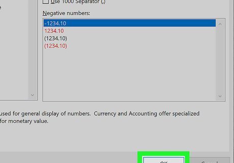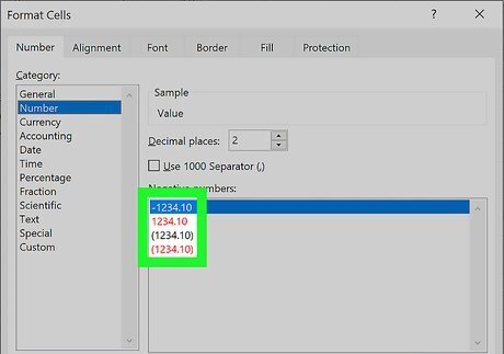 Select a display format for negative numbers (optional). You can select how you're going to see negative numbers in the "Negative numbers" box. It's at the bottom of the Format Cells window.