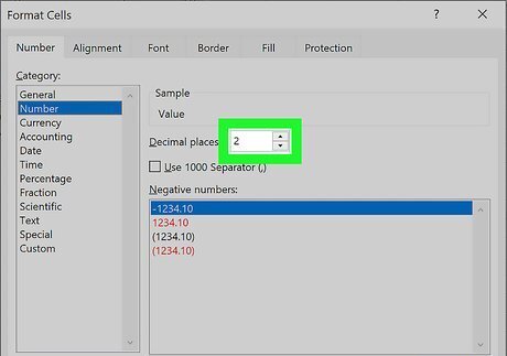 Select the decimal places you want to use (optional). You can use the arrow keys next to the "Decimal places" counter or manually type the number of decimals you want use. All the selected cells will show the decimal places indicated here.