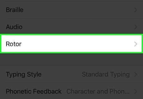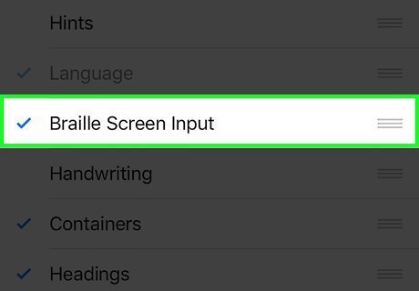 Select Braille Screen Input. You may have to scroll down to find it. This will add the braille input control to the VoiceOver rotor, an on-screen dial you can use to launch accessibility commands on the fly. All rotor options are listed on this screen. If you want to remove a feature you don’t use, tap to deselect it.
