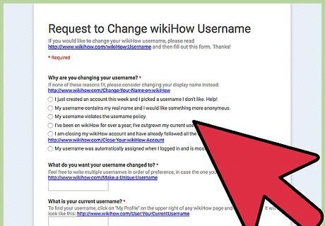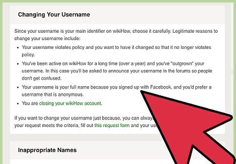 Read the username policy. Make sure your situation meets one of the following criteria: Your username violates policy and you want to have it changed so that it no longer violates policy. You've been active on wikiHow for a long time (over a year) and you've "outgrown" your username. In this case you'll be asked to announce your username in the forums so people don't get confused. Your username is your full name because you signed up with Facebook, and you'd prefer a username that is anonymous. You are closing your wikiHow account. You recently created an account and chose a username you don't like.