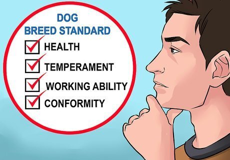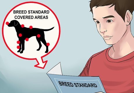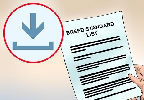 Download the breed standards. When you have searched for the dog's breed standards, you can then download the breed standards. Most parent breed organization websites have a comprehensive list of breed standards available on their website. This might include videos, illustrations, or packets of information.