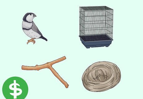 Budget for both the birds and additional costs. Finches can cost anywhere between $10 and $100. But you also have to consider the cost of the cage, food, water dishes, and perches. In addition, you need to budget for possible veterinarian bills in case your bird gets sick or injured. A bird cage costs between $60 and $1,000. Food and water bowls cost between $8 and $30. Toys cost between $20 and $100. Two perches cost between $12 and $30. A nest will cost between $4 and $12. A bag of bird food will cost between $9 and $20.
