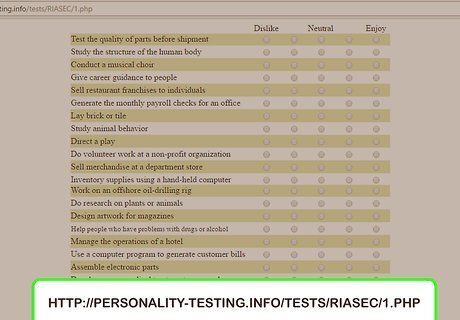 Take a personality test. Look into options such as the RIASEC/Holland Interest Scale or the Myers-Briggs Type Indicator (MBTI). You can find many free versions on the web. The RIASEC scale will determine whether you're realistic, investigative, artistic, social, enterprising, or conventional. The MBTI will help you figure out whether you're introverted (shy) or extroverted (outgoing).