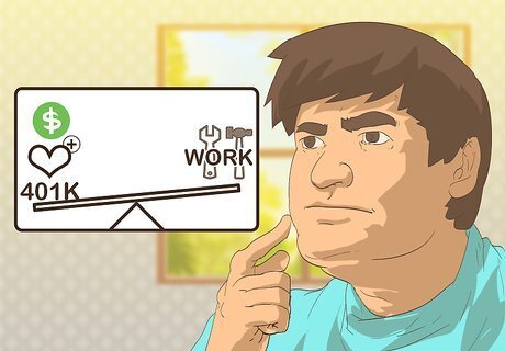 Weigh the importance of benefits. Regardless of your age, you should take health insurance and the retirement package into consideration. Benefits that depend on your personality- and motivation types include extended vacation time, flexible work days, and telecommuting. If you're promotion-focused, you might enjoy flexible hours. On the other hand, if you're social, you might prefer to avoid telecommuting.