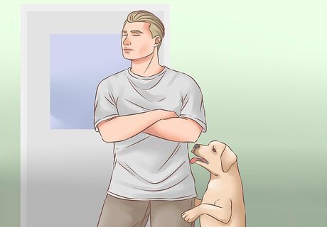 Ignore undesirable behavior. Before your dog is trained, they will likely engage in inappropriate behavior. The best way to respond to lapses in good behavior is often to ignore it, which trains your dog to stop what they are doing via positive punishment. Meanwhile, be sure that positive reinforcement is withheld into the dog engages in the behavior you want to see. For example, if your dog is begging for food, neither yell at them nor give them anything. Simply ignore them. Instead, train them to lay down away from the table during meals, and reward them with a treat when they do so. Another example of positive punishment is turning away whenever your dog jumps up. By ignoring this undesirable behavior, you're teaching your dog not to do it anymore.