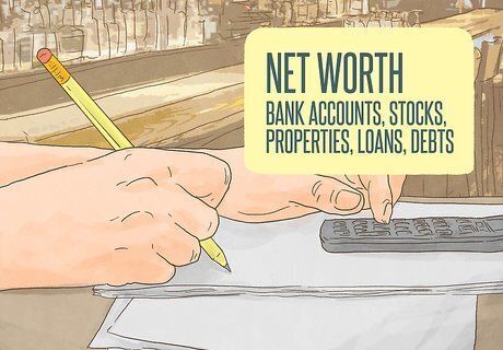Calculate your net worth. Next, calculate your net worth. Your net worth is a measure of how much all your property is worth, minus money you owe to others. Consider the following: Cash in bank accounts Stocks and bonds Real estate Cars, boats, and other vehicles Any other highly valuable possessions (e.g. high-end entertainment systems, etc.) Loans, credit cards, and other debt