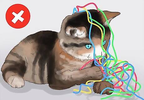 Avoid giving kittens yarns and strings. If you do let your cat play with yarn and string, do so only with your supervision. Yarn and string are easily swallowed and can get stuck inside your cat's intestines, which may necessitate surgical removal. If you get your cat yarn and string, never leave it laying around when you are not present. You should also avoid rubber bands, as cats may swallow them.