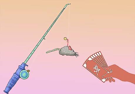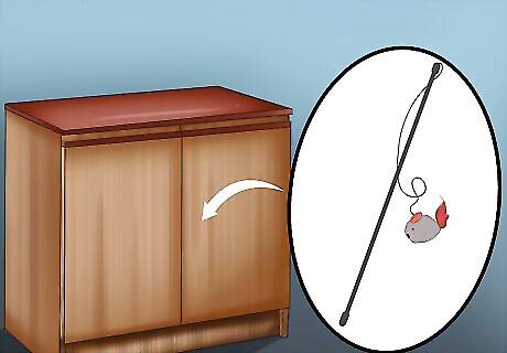 Keep fishing pole toys out of reach when not in use. Fishing pole toys are interactive toys meant to be used only when a person is present. You can have a lot of fun dragging a fishing pole toy along the floor or dangling it in the air for your cat to catch. However, cats may swallow the string from toys when you're not present. If a fishing pole toy has embellishments like feathers, your cat may swallow these as well. Keep fishing pole toys out of your cat's reach when you are not present. Cats are excellent climbers and tend to get into things, so make sure to pick a very secure location. A cupboard that locks securely, for example, is a good place to keep a fishing pole toy.