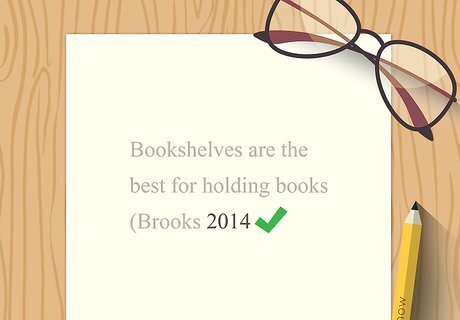 Put the year of publication after the space. The year of publication should be on the front or back of the title page. Just include the year, not a month or day. Your citation will look like this now: Bookshelves are the best for holding books (Brooks 2014