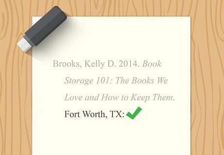 Put in the place of publication. You can find the publication city on the front or back side of the title page. Write down the city in the entry and add a comma and the state abbreviation if it's not well-known. Otherwise, you can just use the city name. Add a colon after the place of publication. For instance, your bibliographical entry might be like the following: Brooks, Kelly D. 2014. Book Storage 101: The Books We Love and How to Keep Them. Fort Worth, TX: