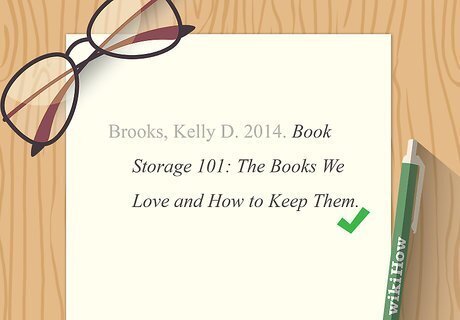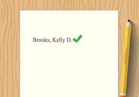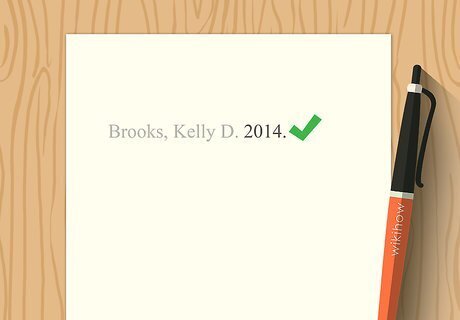 Start with the author's last name, then the author's first name. You need the author's last name to alphabetize your reference list page, so you place it first, followed by a comma. Use the author's first name after that, followed by a period. Add the author's full name, unless they use initials in the book. If the author includes a middle initial, use it as well. Your bibliographical citation will start out like this: Brooks, Kelly D.