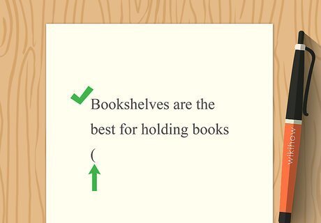 Put an open parenthesis before the punctuation in the sentence. The citation goes right after what you're citing, which could be before a comma or before the end period. You should cite anything that you paraphrase or quote. You'll start with an open parenthesis. Your citation will start out like this one: Bookshelves are the best for holding books ( On the other hand, you might write: In a study of this psychological trait ( In the second example, you're citing the study, so the citation comes directly after it.