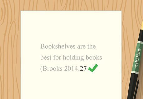 Use a colon to add a page number as needed. Add the page number when you quote or you refer to a passage from the text directly. Otherwise, it's not required, but it may still be helpful for the reader. Put a colon right after the year, then write in the page number with no spaces. For example, your citation might look this way: Bookshelves are the best for holding books (Brooks 2014:27