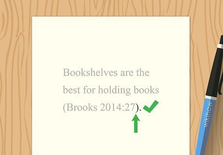 End the citation with a close parenthesis. Whether you end the citation right after the year or after the page number, put a close parenthesis to show you're finished with the citation. Place the sentence punctuation after the close parenthesis. Your completed citation will look like this: Bookshelves are the best for holding books (Brooks 2014). It may look like this instead: Bookshelves are the best for holding books (Brooks 2014:27).