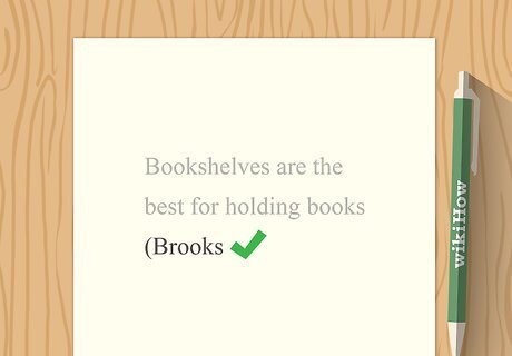 Add the author's last name. The author's last name goes directly after the open parenthesis with no space in between. However, you do put a space after the author's last name. Your citation might look like this one now: Bookshelves are the best for holding books (Brooks