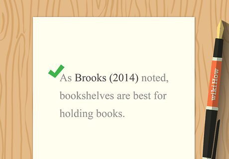 Skip the author's name in the citation if you use it in the sentence. If you introduce the idea using the author's last name, you don't need to repeat it in the citation. Just use the date or the date and the page number in parentheses directly after the author's name rather than at the end of the information. An example of this citation would look like this: As Brooks (2014) noted, bookshelves are best for holding books.