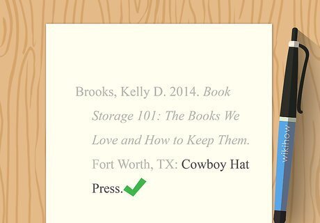 End with the name of the publishing company. Typically, you can find the publisher's name on the front or back of the title page. Sometimes, it's listed in both places. Put a period after the publisher to end the bibliographical entry. Your final citation will look like this: Brooks, Kelly D. 2014. Book Storage 101: The Books We Love and How to Keep Them. Fort Worth, TX: Cowboy Hat Press.