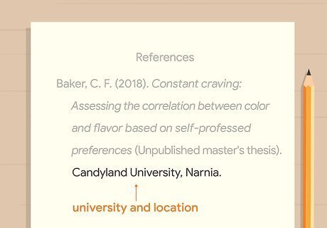 Close with the university and location. Type the full name of the university followed by a comma. If the university is located in the US, type the city and state, separated by a comma and followed by a period. If the university is located outside the US, type the city and country separated by a comma, with a period at the end of the name of the country. Do not abbreviate place names. Omit the name of the city if it is included in the name of the university. Example: Baker, C. F. (2018). Constant craving: Assessing the correlation between color and flavor based on self-professed preferences (Unpublished master's thesis). Candyland University, Narnia. APA Reference List Entry — Unpublished Thesis Author, A. A. (Year). Title in sentence case: Subtitle in sentence case (Unpublished [level] thesis). University Name, University Location.