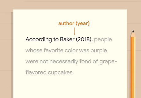 Place the year after the author's name in your text. If you mention the author's name in a sentence paraphrasing information from the thesis, add the year the thesis was submitted immediately after the author's name. This parenthetical falls inside any punctuation that would normally follow the author's name. For example, you might write: "According to Baker (2018), people whose favorite color was purple were not necessarily fond of grape-flavored cupcakes."