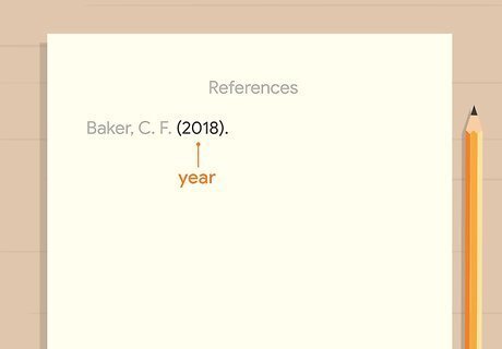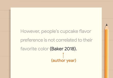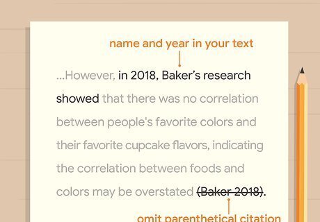 Omit a parenthetical citation if you include the name and year in your text. In some circumstances, the year of publication will be relevant to what you're writing about, and thus worthy of inclusion in the text itself. If that is the case, there's no need to include any parenthetical at all if you're merely paraphrasing the source. For example, you might write: "As late as 2017, scholars suspected that people's favorite foods corresponded with their favorite colors. However, in 2018, Baker's research showed that there was no correlation between people's favorite colors and their favorite cupcake flavors, indicating the correlation between foods and colors may be overstated."