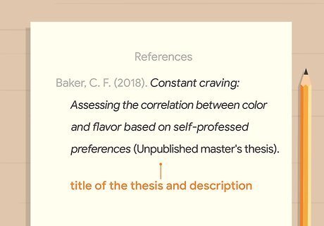 Use the author's name and year for a parenthetical citation. For a standard in-text citation, place the author's name and the year the thesis was submitted in parentheses at the end of any sentence in which you paraphrase information from it. Your citation should fall inside the closing punctuation for the sentence. For example, you might write: "However, people's cupcake flavor preference is not correlated to their favorite color (Baker 2018)."