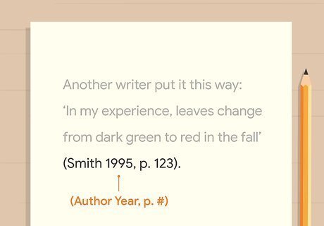 Include a page number for direct quotes. If you quote from your source directly, include the page number or page range where your quoted material can be found. To do so in a full parenthetical, place a comma after the year of publication, then add "p." for a single page number or "pp." for a range, followed by the appropriate number or range. The citation goes outside the closing quotation marks but inside the closing punctuation for short quotes. For block quotes, place the citation outside the closing punctuation for the quote. If you included the author's name in your text, place the year immediately after the author's name. Then place a parenthetical after the quote with only the page number or range. Parenthetical In-Text Citation Format for a Direct Quote: (Author Year, p. #).
