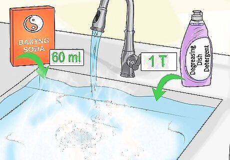 Create a cleaning solution. You can choose between several cleaning solution options, depending on how dirty your filter is and what products you have on hand. The most basic solution is to fill a sink or basin with boiling water, a quarter cup (60 mL) of baking soda, and a tablespoon of degreasing dish detergent.
