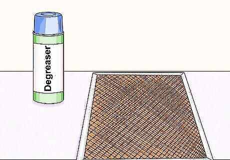 Use a degreaser for stubborn buildup. You can also use a degreasing oven cleaner if your filter is especially grimy. If you use a concentrated cleaner, make a solution by mixing it with water. Check the product’s label for a recommended ratio. For thick, stubborn grease deposits, soak the filter in an auto degreaser. Wear rubber gloves when using an oven or auto degreaser.