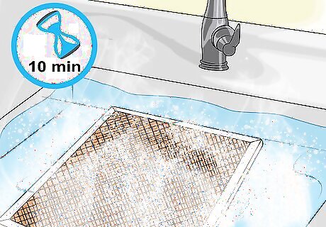 Soak the filter in the cleaning solution for ten minutes. Whether you choose a baking soda solution or a degreaser, you should soak the filter for ten minutes. Soaking will help cut through grease deposits and you'll have less scrubbing to do.