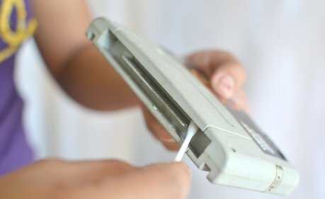 Carefully, but firmly rub the alcohol doused cotton swab against the copper contacts of the game cartridge. Rub about 2 times back and forth, and switch to the other side of the swab. Continue until the swab comes back without dirt on it.