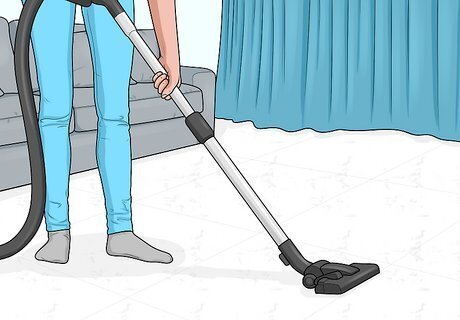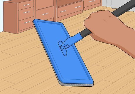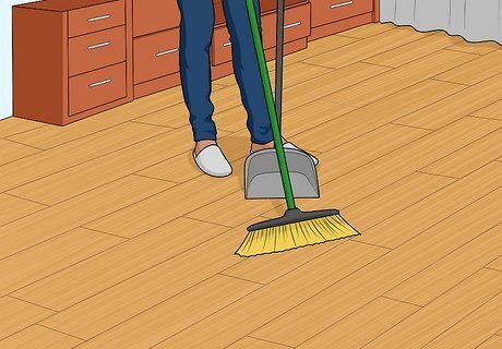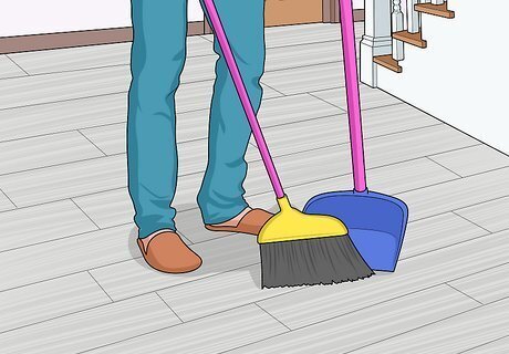 Remove major debris from your floor first by sweeping up large pieces into a dust pan and emptying into the trash. If you have one, follow this by using a microfiber dust mop to pick up finer dirt from the floor that is harder to see. Pick up with the broom and empty into the trash. For an even cleaner surface, use a vacuum cleaner on the floor on the lowest carpet/surface setting (if available). Vinyl floors are relatively durable so you can use the vacuum cleaner with confidence.