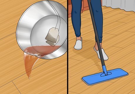 Pour a small amount of tea water on wood floor and follow through with mop. Don’t over soak the floor or else you will end up with streaks.