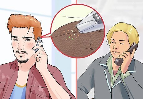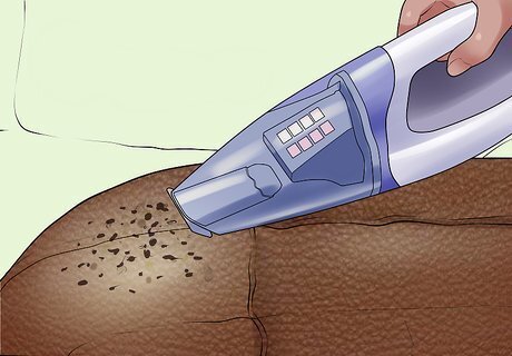 Vacuum or brush away solid debris. Attach the brush accessory to the hose of a vacuum cleaner. Use a medium setting and vacuum up dirt. Alternatively, you could use a brush with soft bristles. Gently sweep up the dirt into a dustpan. Regardless of which method you use, avoid rubbing the leather too harshly. This could set in the stain.