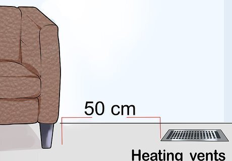 Place your furniture at least 50 centimetres (20 in) from heat sources. This includes heating vents, radiators, and fireplaces. Since space heaters are portable, avoid placing them too close to the furniture. Arid heat can cause the leather to dry and crack.
