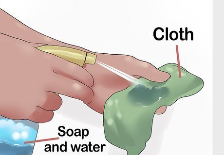 Dampen another cloth with mild soap and water. Wet another cloth or paper towel with water. Add a few drops of clear mild soap to the wet cloth. Wring it out to drain the excess water and to produce a soapy lather.