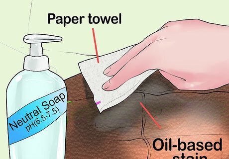 Clean oil-based stains with neutral soap. Use a paper towel to wipe away the substance. Avoid rubbing too hard to prevent the mess from getting ground in to the upholstery. Then, soak one of the cloths in diluted soap with a neutral pH (6.5-7.5). Begin gently rubbing the stain at the outer edge and work your way inward. Finally, dry the wet area with the other cloth. Continue blotting until all the moisture is absorbed. Don't use a hair dryer. Oil-based substances include oils, mayonnaise, chocolate, and ketchup.