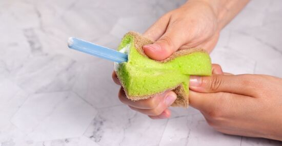 Scrub the outside of the straw with a sponge, then rinse. Don’t forget to give the outside a quick scrub to make sure it’s clean, as well. Use dish soap and a sponge to scrub the outside of the straw. After scrubbing, rinse the soap off using warm water. If you don’t have a sponge available, soap up your hands and scrub the outside of the straw with your fingers. Rinse the inside of the straw under warm water to remove the soap, too.